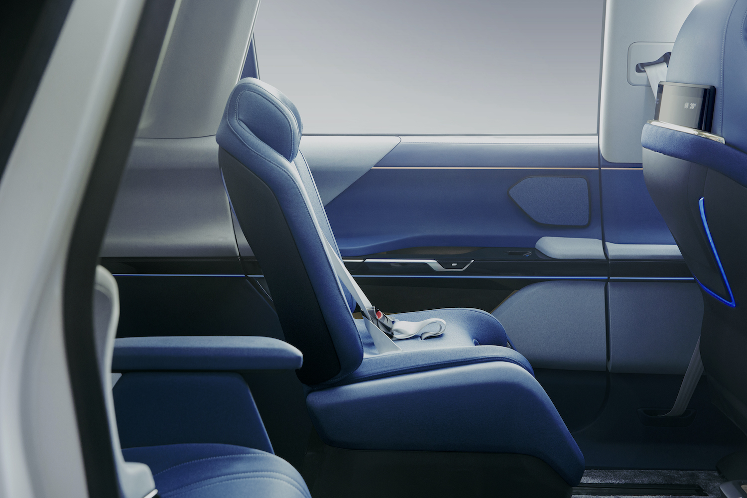 在未来,随着车辆的使用需求变化,车内空间也需要有灵活变化的能力。延锋的这套座舱在这方面也有一些新意:在后排,除了标配的零重力座椅和隐形香氛之外,用户还可以选装一体式儿童座椅,不使用时,可以翻折为第三排乘客的腿托。XiM21 采用的是双速电机驱动的长滑轨,扶手箱的位置也可以在第一排到第三排之间自由活动,满足不同的需求场景。
