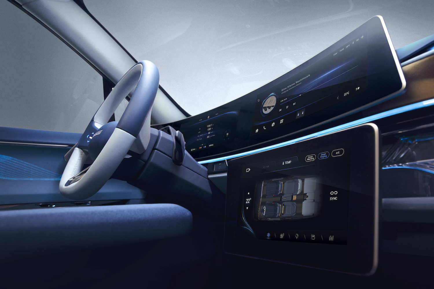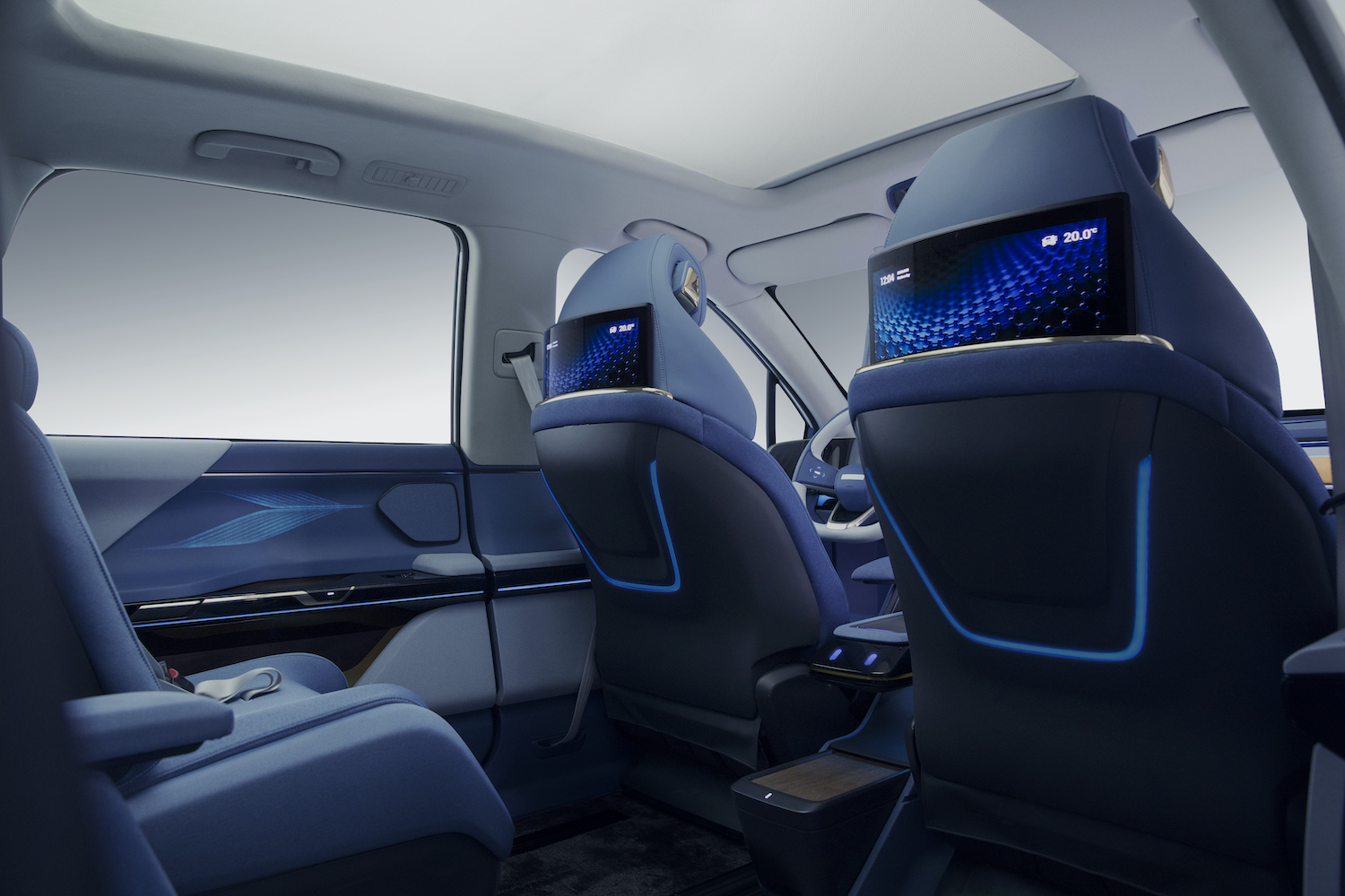 车内一共拥有 5 个屏幕。前排的三块屏幕分别是仪表中控的双 12.3 英寸曲面双联屏,以及可在中控和副驾之间移动的大屏;后排则是两块可升降的娱乐屏,并且可由前排控制分享内容到后排。
