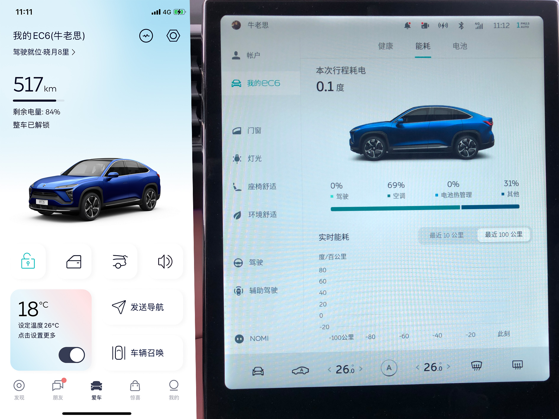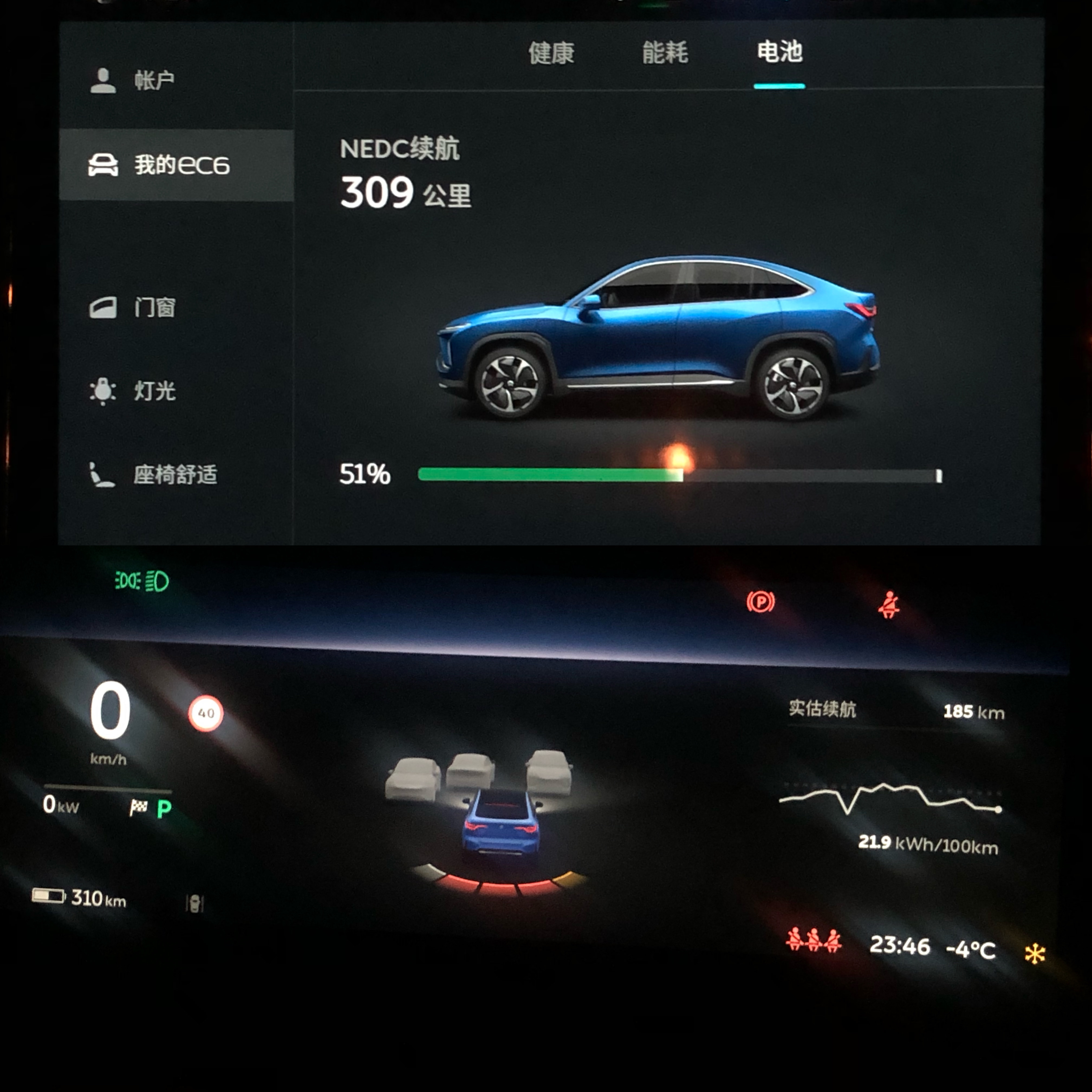 大半个小时后到家,今天路线图显示大约需要 168.9 公里,但算上其它的路程估计在 180 公里左右,看一下剩余续航吧。NEDC 剩余 309 公里,实估续航 185 公里,剩余电量 51%,能耗在百公里 21.9kWh。出发前的数据减去回家时的数据,发现实估续航的参考度还是大于 NEDC 的。总体看这辆 EC6 长续航版还是比较抗用的,一天下来没有产生一丝的里程焦虑,还剩下过半的电量。要是单日行驶里程大于 350 公里以上的情况,建议在蔚来 APP 上提前规划充电站点。