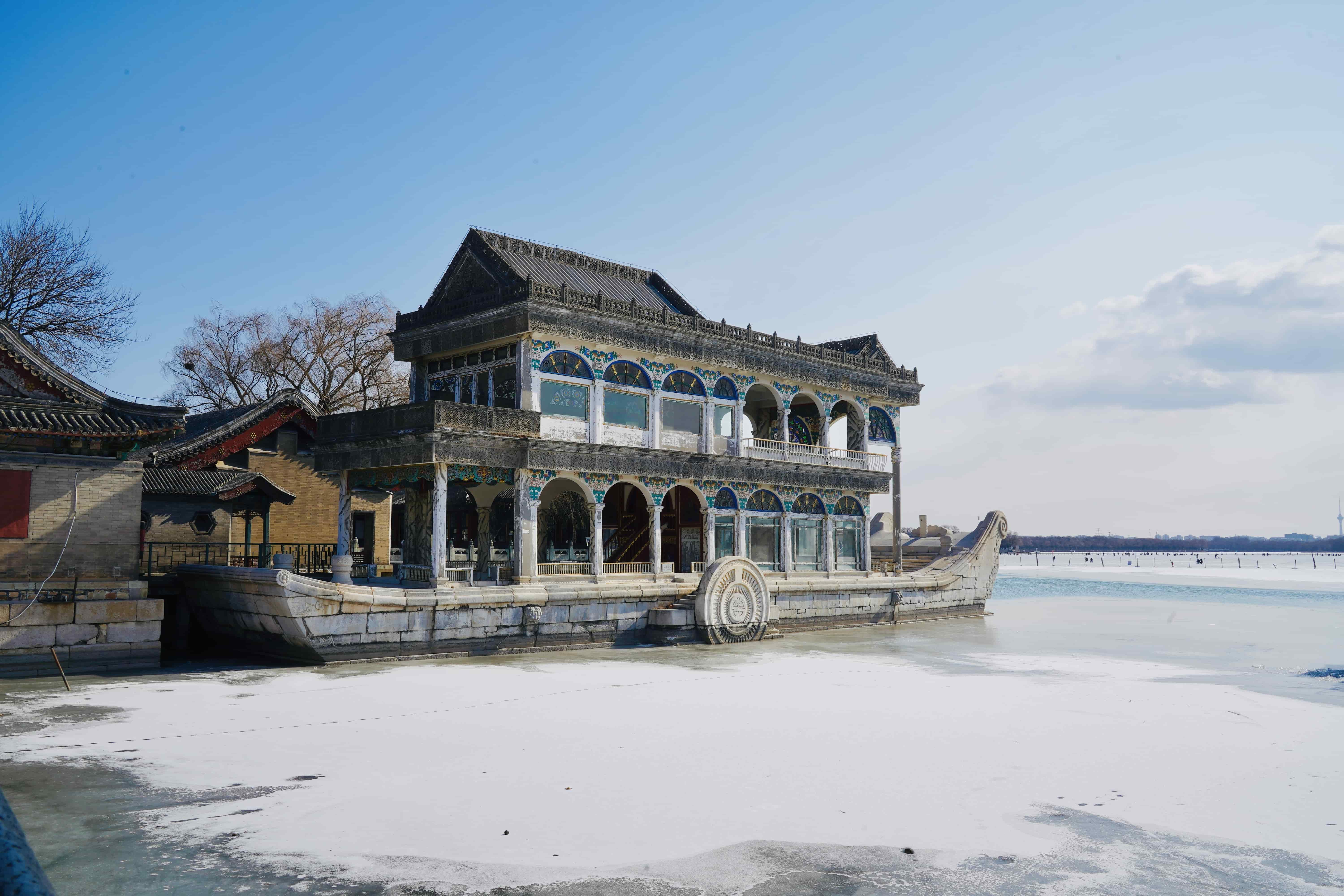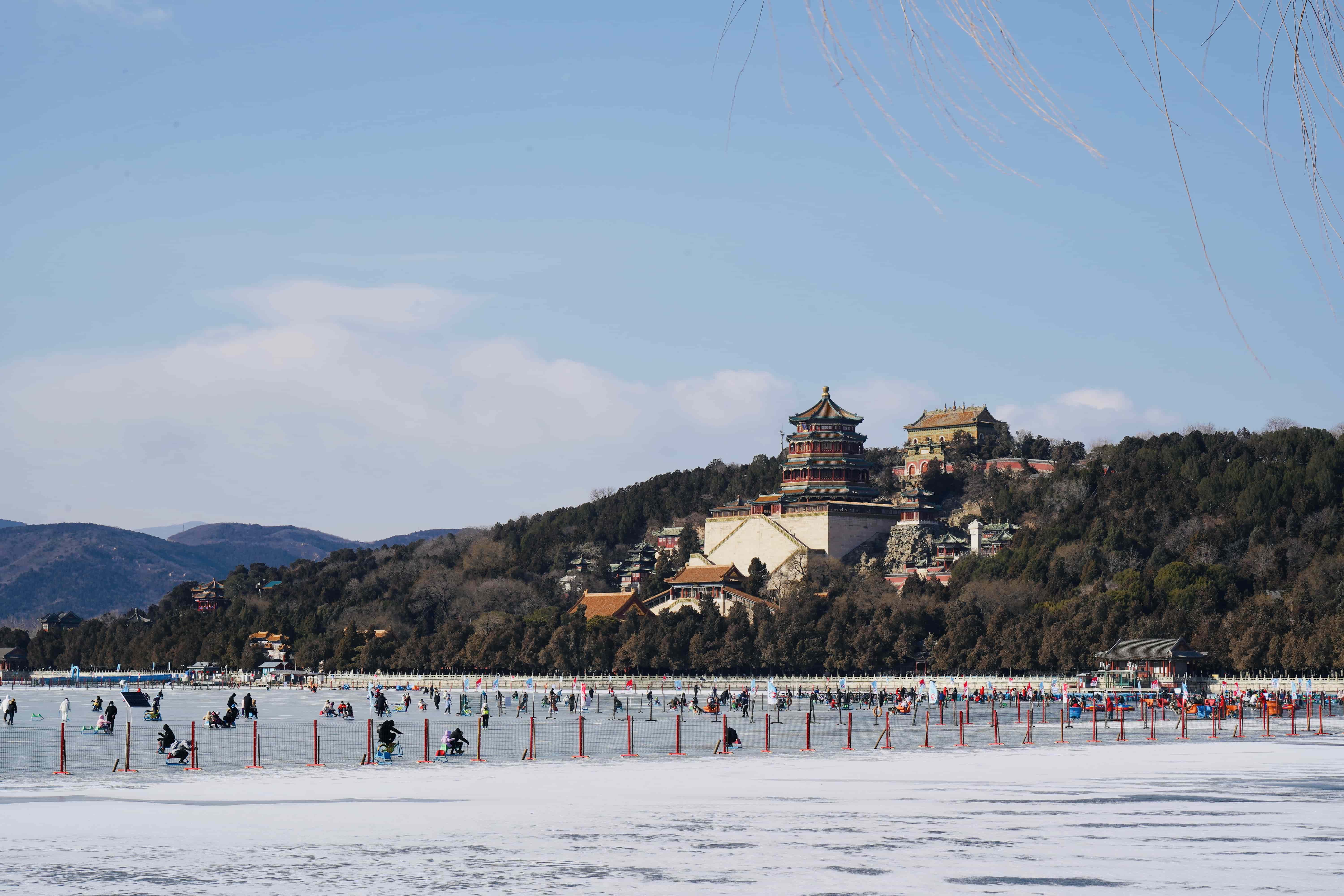 冬季已将昆明湖冰封起来,游客们正感受着古人「移步换景」的视点,各类冰车也满足了大家的玩乐需求,冰场的四周布置了许多冬奥吉祥物、冬奥宣传标语等等。