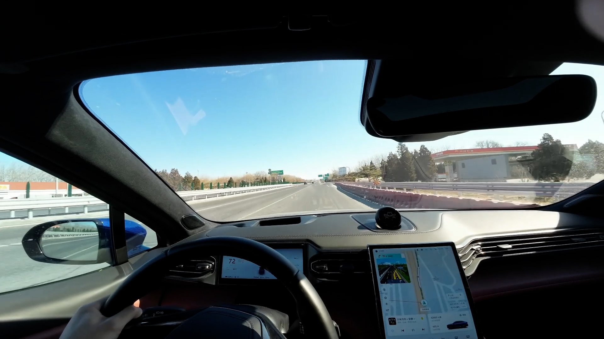 「领航开始」,在行驶过程中,直线或者较大曲率的路段都很轻松的保持在车道中间,并且在限速路段会自动降低车速。自动变道时通常会距离后方车辆很远时才变道,比较有意思的是冬奥期间 NOP 会经常向冬奥车道的顺畅路,这就需要不时的将车辆调整回来。若遇到开启转向后,后方车辆没有让行,NOP 会主动取消操作让车辆保持在原路。不过,遇到其它车辆突然斜插入前方的超车情况,NOP 刹车的力度就会加大许多。(愿某某 8 的大佬们打个转向灯吧。)