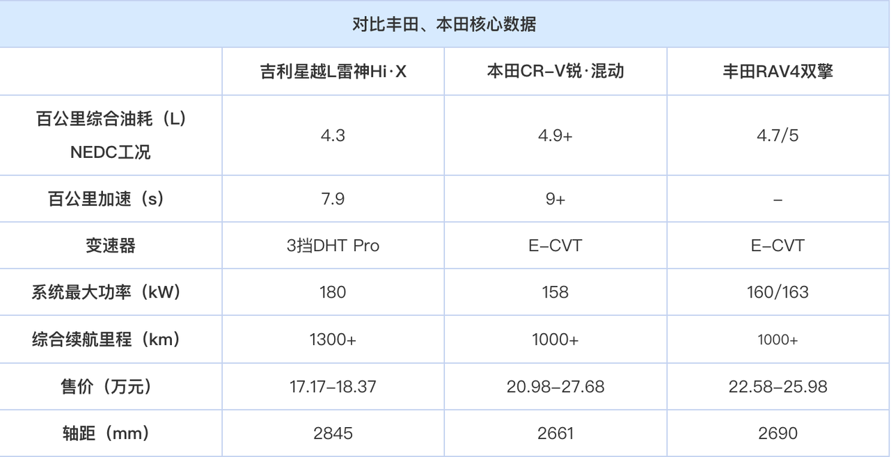 今天,我有机会能试驾到星越 L 雷神混动 Hi·X 顶配版,切身实在地体会到了厂家所说的超低油耗的确货真价实的同时,又能提供 7.9s 加速的动力,功率比日系混动大了 20 多千瓦,轮上最大输出扭矩可达 4920 牛米,是日系同级混动的 1.5 倍,加速也快了 1-2 秒。要知道这辆车整备质量达到了 1.8 吨,比日系同类型车重了 133 公斤,能达到这样兼顾动力和百公里 4.3L 油耗的表现已经很出色了。