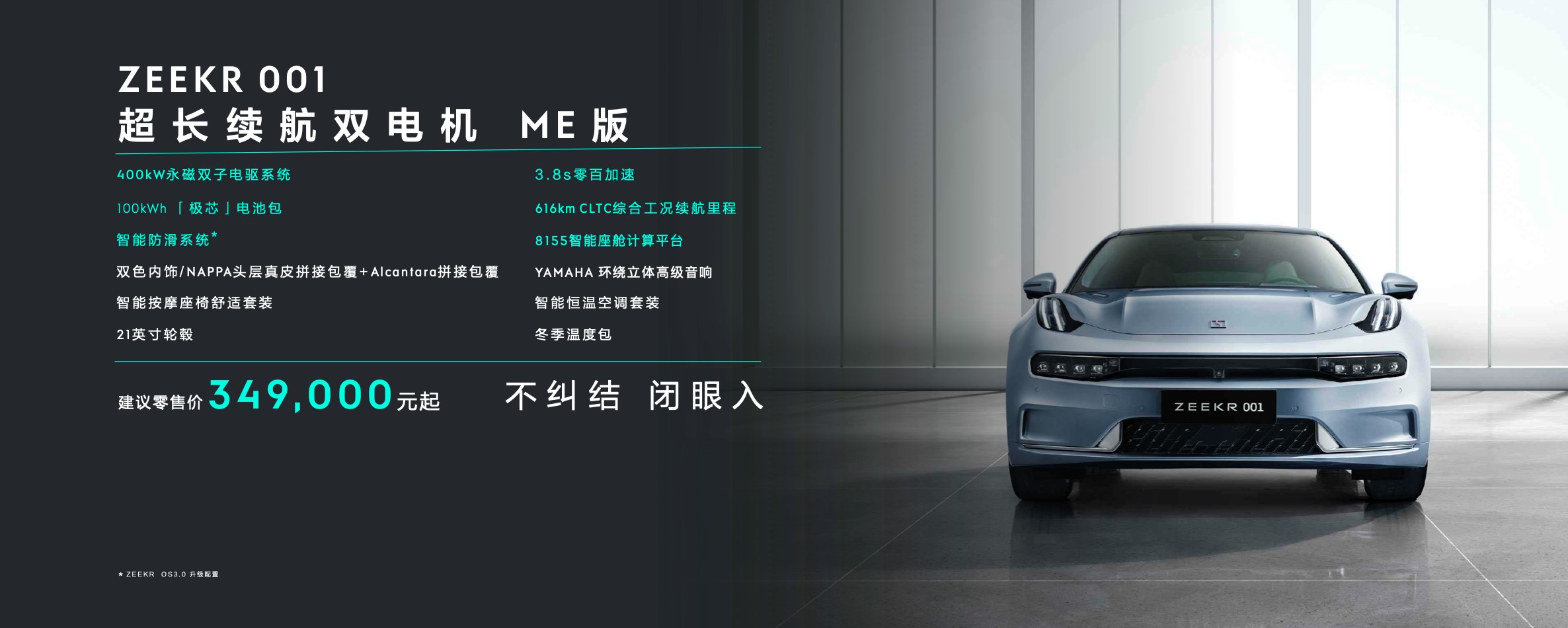 根据所有车主和意向用户的选购大数据分析和极氪伙伴线下调研,极氪基于用户呼声最高的「双百组合」—— 高性能双子永磁电机布局和 100 度「极芯」电池包,增加一款源于用户需求的极氪 001 ME 版车型。