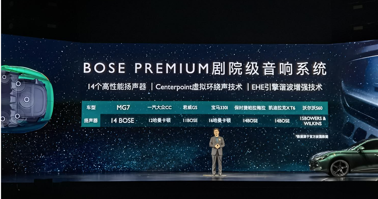 MG7 采用了时下非常流行的双联屏一体式设计,将仪表盘和中控屏集成在了 33 英寸一体式显示屏中,但是究竟有多少屏幕占比还是未知数,因为现场发布会只是外观造型的体验,所以只能先看官方发布的内饰座舱图片,同时车内还配有 14 扬声器的 BOSE 音响系统,做到了齐平甚至超越同级竞争对手的硬实力产品力。