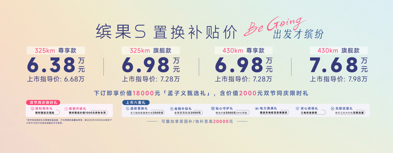 缤果 S 共推出 325km 尊享款、325km 旗舰款、430km 尊享款、430km 旗舰款四款配置,上市指导价为 6.68 万-7.98 万元,叠加置换政策可享置换补贴价 6.38 万-7.68 万元,更可叠加享受至高 20,000 元的国家/地方购车补贴。