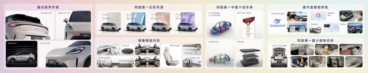 步入「舒屿座舱」,细节皆巧思。缤果 S 以「静奢栖居美学」为灵感,通过环抱式布局、贯穿式内嵌风幕与柔感贝壳座椅等设计,营造出沉浸式的舒适氛围。搭配同级唯一的 6 扬声器系统与阿嘉米斯专业声场调校,进一步提升了座舱的静谧质感与听觉享受。12.8 英寸高清大屏内置「1+N」灵语 AI 中枢大模型,深度融合 DeepSeek 大模型,以更全面的壁纸玩法、八大区域的方言沟通、更多的智能场景应用,为用户带来真正「更懂你的」智能座舱体验。