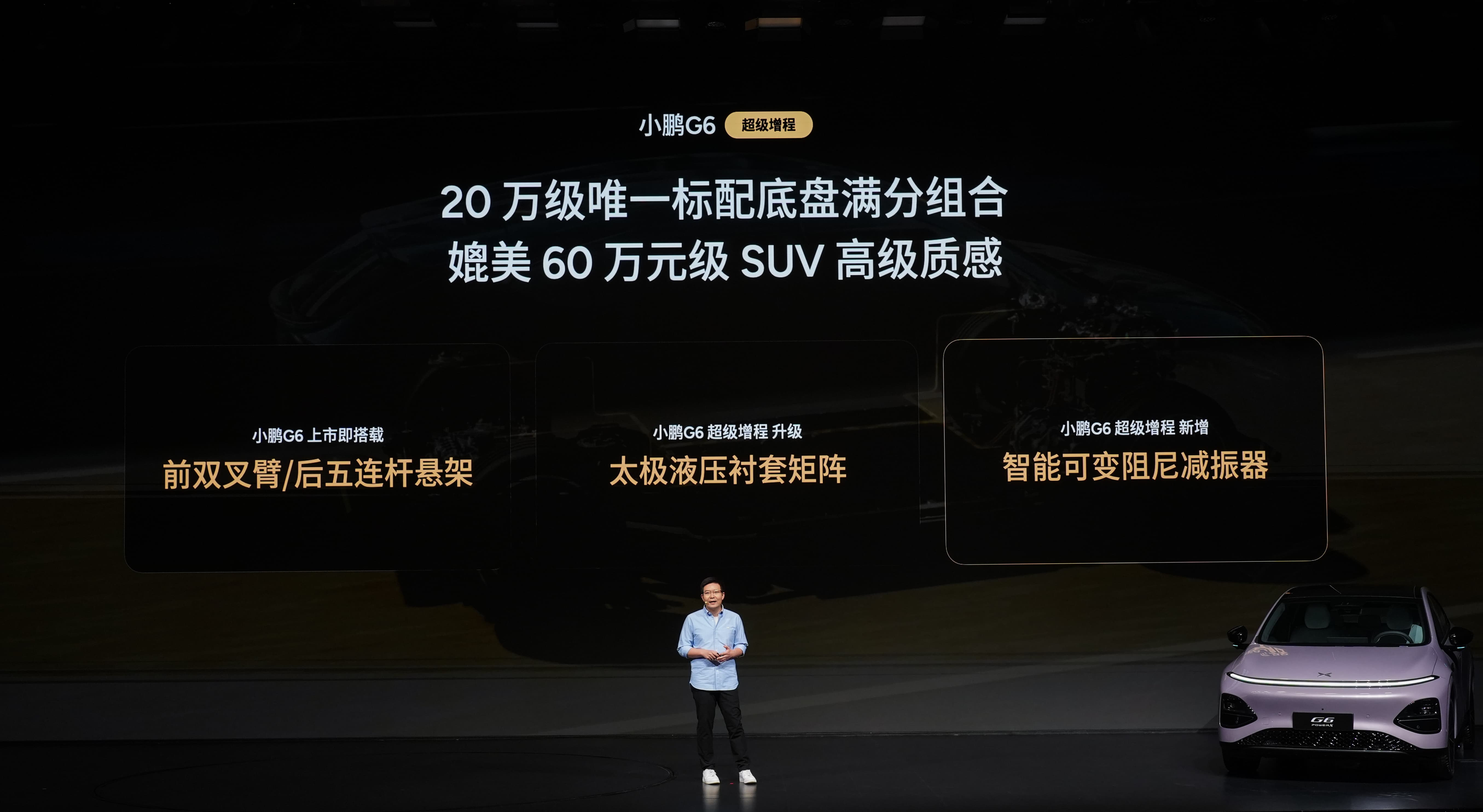 小鹏 G6 底盘立足用户需求持续进化,从最初专注单人运动操控,全面升级为满足一家人的驾乘舒适。此次,小鹏 G6 超级增程全系标配太极 AI 底盘,同级唯一标配前双叉臂/后五连杆独立悬架+太极液压衬套矩阵+智能可变阻尼减振器,以 20 万级唯一标配底盘满分组合,拥有媲美 60 万级 SUV 的高级质感,让每位驾乘者都能拥有良好的体验。新车还拥有行业领先的 5 项 AI 底盘能力,拥有感知广、执行快、可迭代的优势,可实现最远提前 200m 识别、最大提前 300ms 调节,并具备超强自学习能力,最快 21 天可迭代一个新功能,轻松应对城市、乡村、高速等多种路况,适配家庭全场景的驾乘需求。