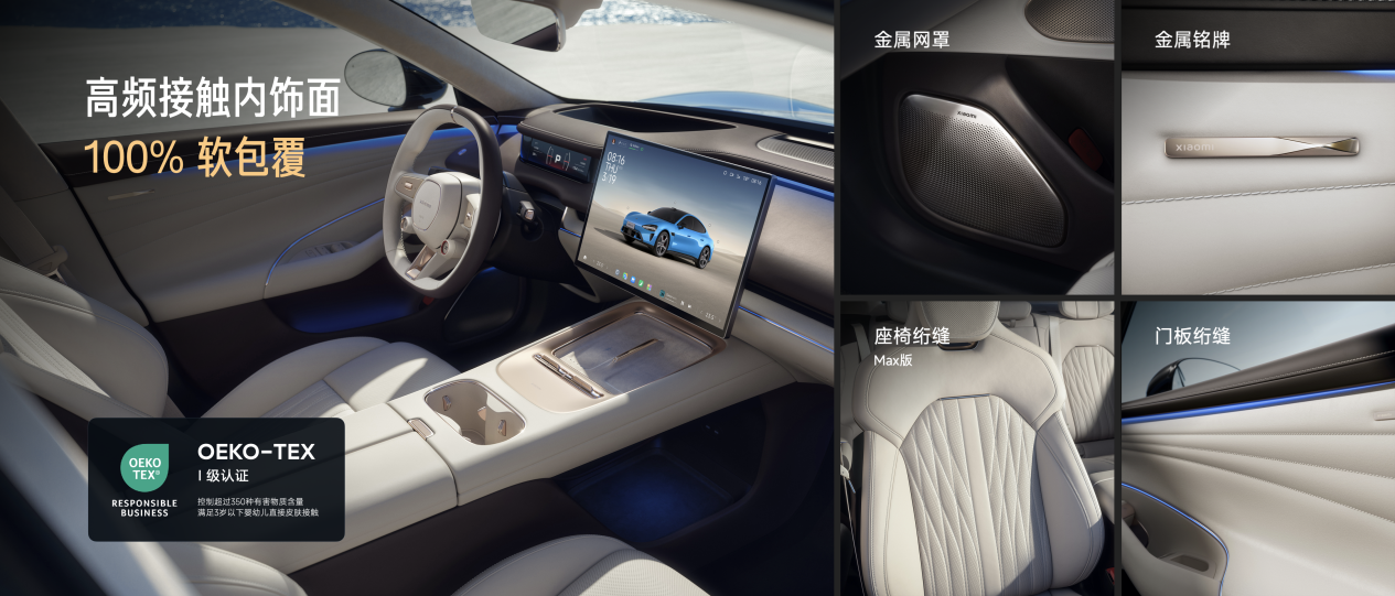 在内饰体验方面,新一代 SU7 的高频接触面接近 100%软包,且通过了 OEKO-TEX 100 最高等级认证,满足 3 岁以下婴幼儿皮肤直接接触,孕妇、小朋友都可以放心乘坐。