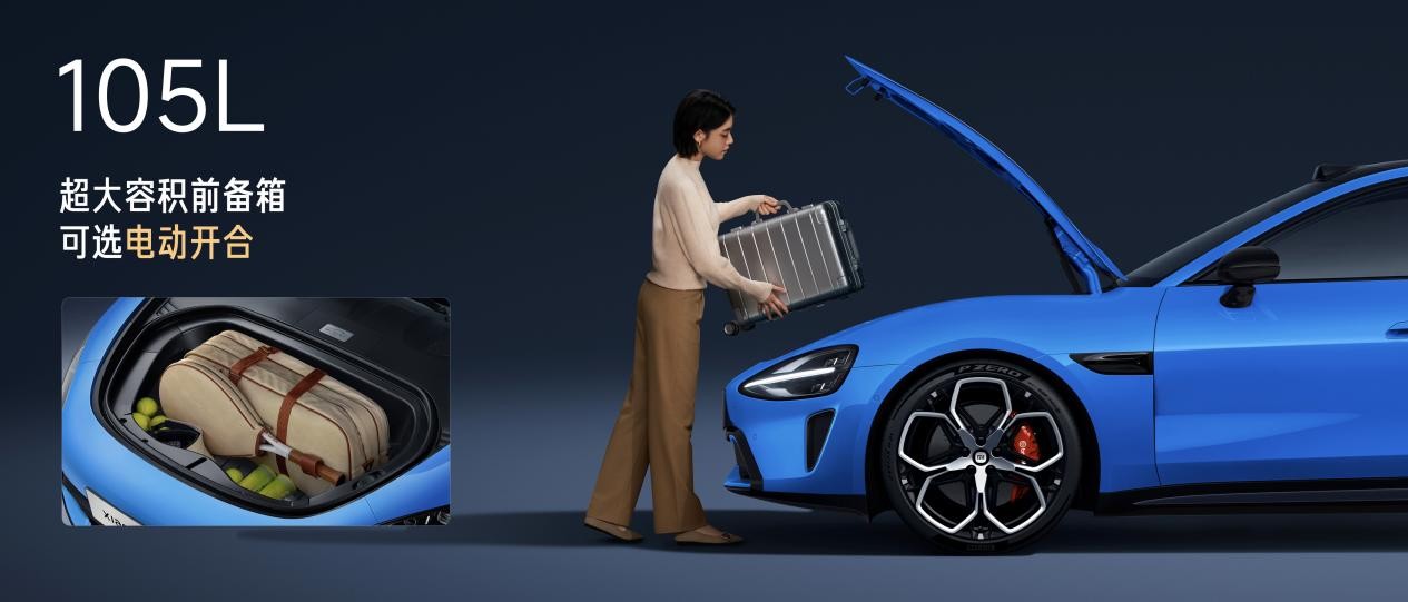 全系标配 Ultra 同款电动前备箱 ,支持 8 种开合方式,容积达 105L,可容纳 20 英寸登机箱。开启方式包括车外实体按键、中控大屏、小米汽车 APP、小米汽车 APP 小部件、遥控钥匙、UWB 近场控车、车内小爱语音、车外小爱语音。