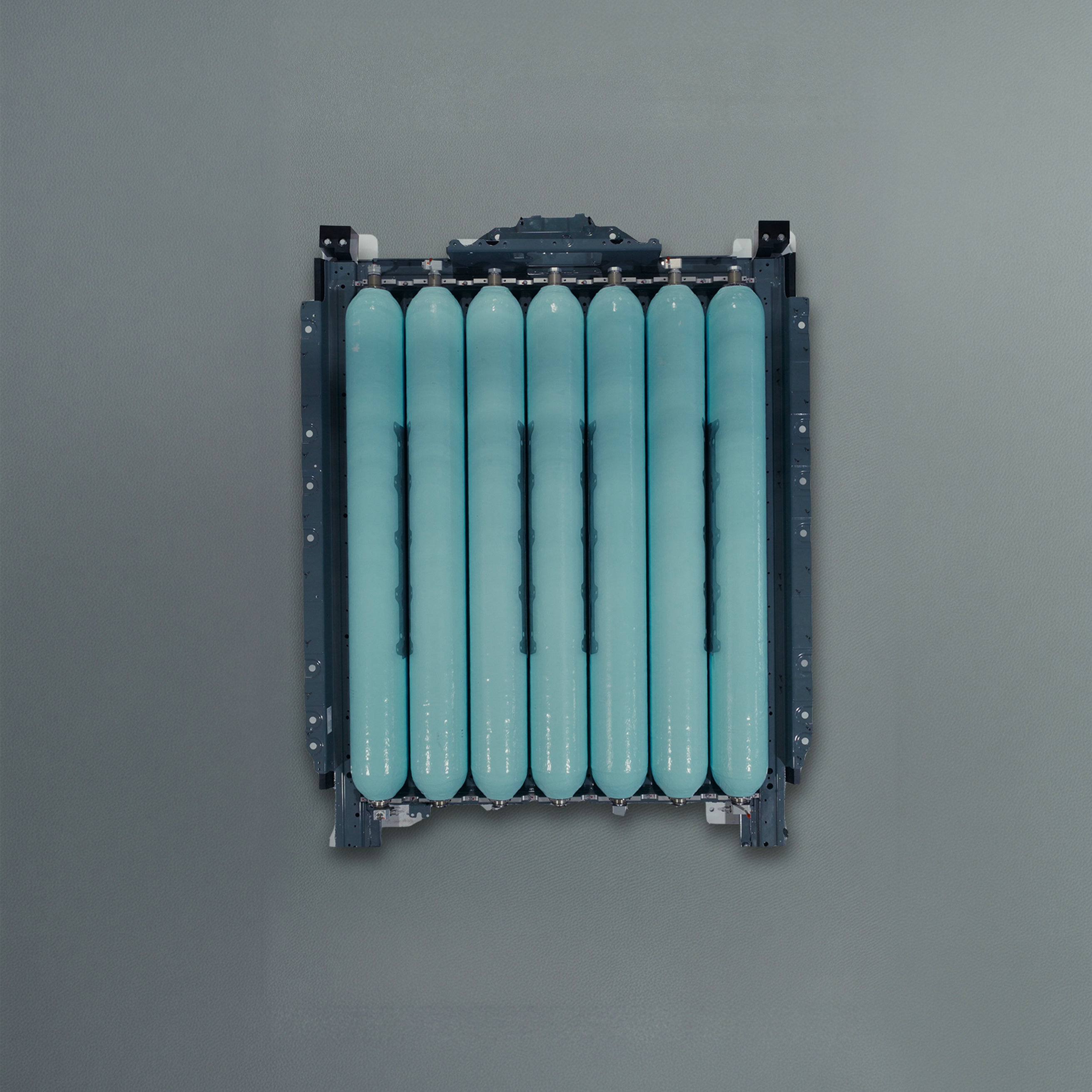 全新的 BMW 氢能扁平化储存系统由七个高压碳纤维复合材料储氢罐组成,这些储氢罐以并联方式集成在坚固的金属框架中。其创新技术在于:系统并非采用多个独立压力容器,而是通过相互连通的 7 个腔体构成一个封闭整体,并由中央主阀统一控制。另外,700 巴 (bar) 高压储氢罐同时受益于车身结构所提供的机械防护,进一步提升了整体安全性。