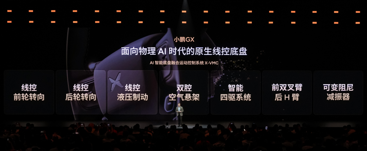 线控底盘既是人驾时人车合一的控制最优解,也是实现完全自动驾驶的关键技术闭环。小鹏 GX 搭载面向物理 AI 时代的原生线控底盘,集成 X-VMC 智能融合系统、线控液压制动、线控前轮转向、双腔液压制动、智能四驱系统、线控后轮转向,全维度重构大车操控体验,打破全尺寸 SUV 笨重拖沓的固有认知。