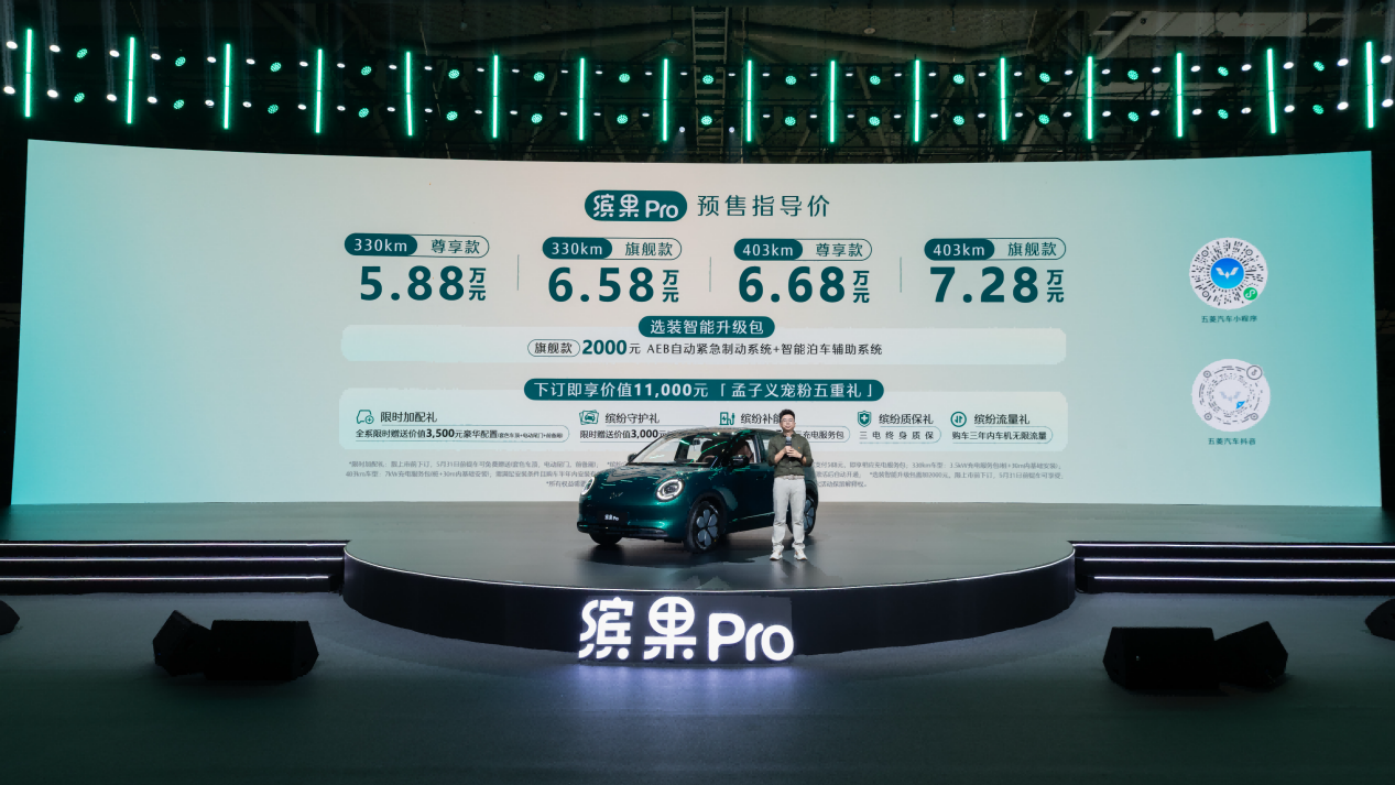 缤果 Pro 共推出 330km 尊享款、330km 旗舰款、403km 尊享款、403km 旗舰款四款配置,预售指导价为 5.88 万-7.28 万元,并推出至高价值 11,000 元的「孟子义宠粉五重礼」: