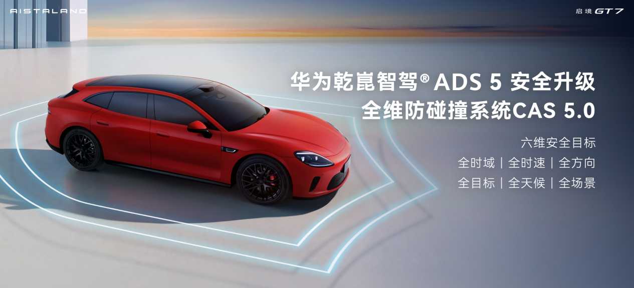 搭载由宁德时代、华为乾崑、启境三方联合定制的新一代麒麟电池,支持 800V 高压平台与 6C 超充倍率,解决用户对电车续航与充电的核心焦虑。启境 GT7 构建「主动安全、被动安全、隐私安全、健康安全「全维安全体系。主动安全层面基于华为乾崑智驾 ADS 5、CAS5.0 全维防碰撞系统;被动安全上标配 8 安全气囊,并采用热成型盾甲车身、2200MPa 热气胀管梁,具备 5 倍顶压能力;隐私安全由华为乾崑端到端网络安全解决方案保障,健康安全则应用母婴级环保座舱标准,以全维防护助力用户安心出行。