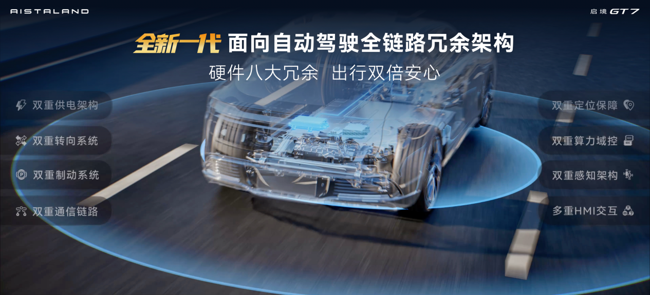 启境 GT7 拥有同级唯一面向自动驾驶的全链路冗余架构,涵盖感知、计算、供电、转向、制动、通讯、定位及 HMI 交互八大核心系统的双重冗余设计。即便在极端小概率的硬件失效情况下,车辆仍具备自动靠边停车的 Plan B。得益于前瞻硬件预埋,让启境 GT7 拥有了持续进化能力。待相关法规体系完善,即可通过 OTA 软件升级,解锁更高阶智驾体验,真正做到常用常新。