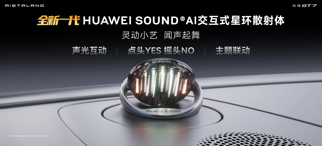 同时,启境 GT7 首创全新一代 HUAWEI SOUND AI 交互式星环散射体。位于中控台顶部中央的灵动智慧伙伴,接到指令会主动转向你、认真聆听,还会点头、摇头,灵动可爱。跑山、智驾等模式还有专属声光联动,让人车交互更具温度与仪式感。