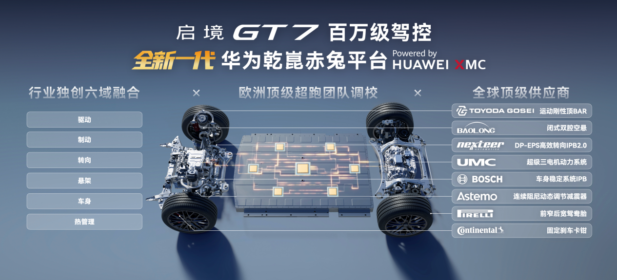 启境 GT7 将新一代华为乾崑赤兔平台、顶级硬件及国际大师调校三大优势进行原生融合,将智能科技注入驾控灵魂,成就启境 GT7 的百万级驾控体验。