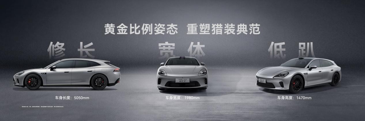 启境 GT7 对标百万级豪华跑车经典美学比例,历经极致打磨,实现——车长 5050mm、车宽 1980mm、车高 1470mm,轮高比 51.2%,修长、宽体、低趴的黄金比例姿态。为了让宽体效果更极致,后轮配 275mm 宽胎,肌肉感拉满。21.5 度启境猎装角,最大化保证车尾空间,轴距达 3000mm,轴长比 59.4%,兼顾美感、实用与舒适。