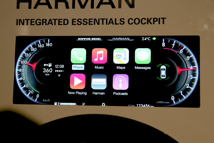 这其实是哈曼推出的概念驾驶舱(Integrated Essentials Cockpit)的一部分。从图片上来看,CarPlay 的界面被左边的时速表和右边的转速表夹在中间,而界面的上方和下方显示的是温度、油量、里程以及档位。